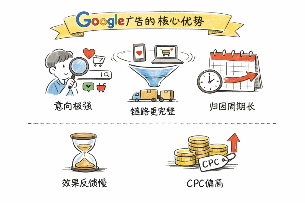 但谷歌也有短板,比如效果反馈慢,需要14-21天才能看到稳定数据;CPC(单次点击成本)偏高,新手容易因关键词优化不当导致成本失控。