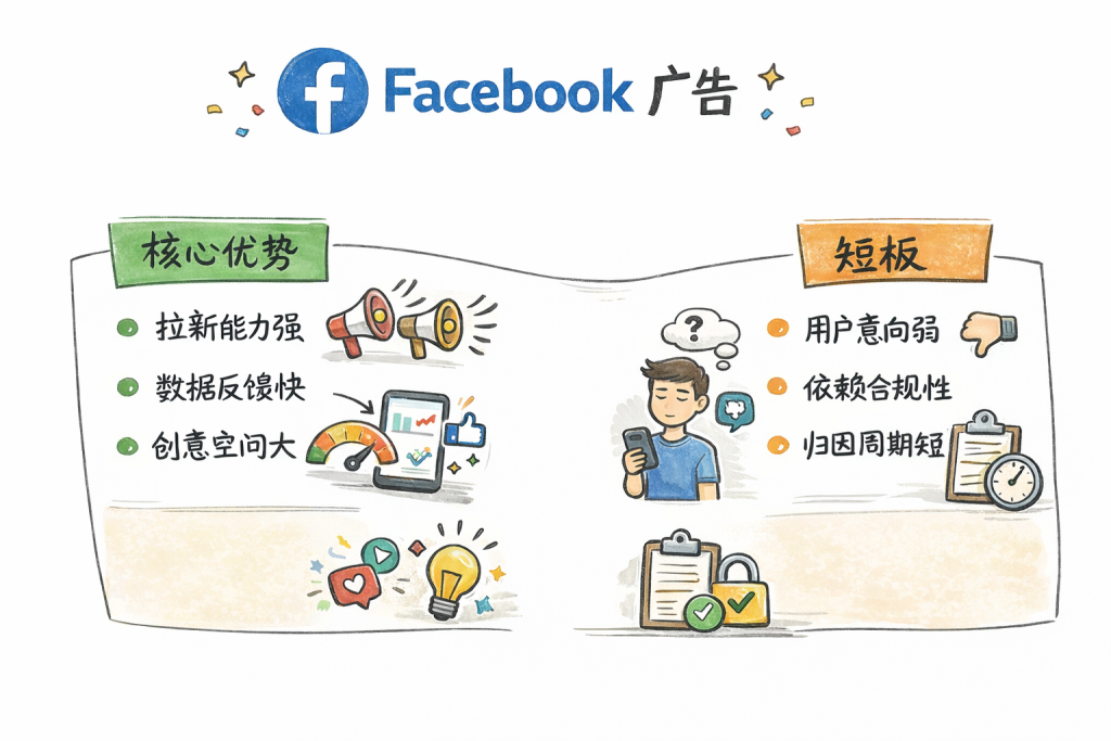 短板也很明显:用户意向弱,转化周期长;账号与素材更依赖合规与稳定性;归因周期短,高客单价产品容易漏算转化。