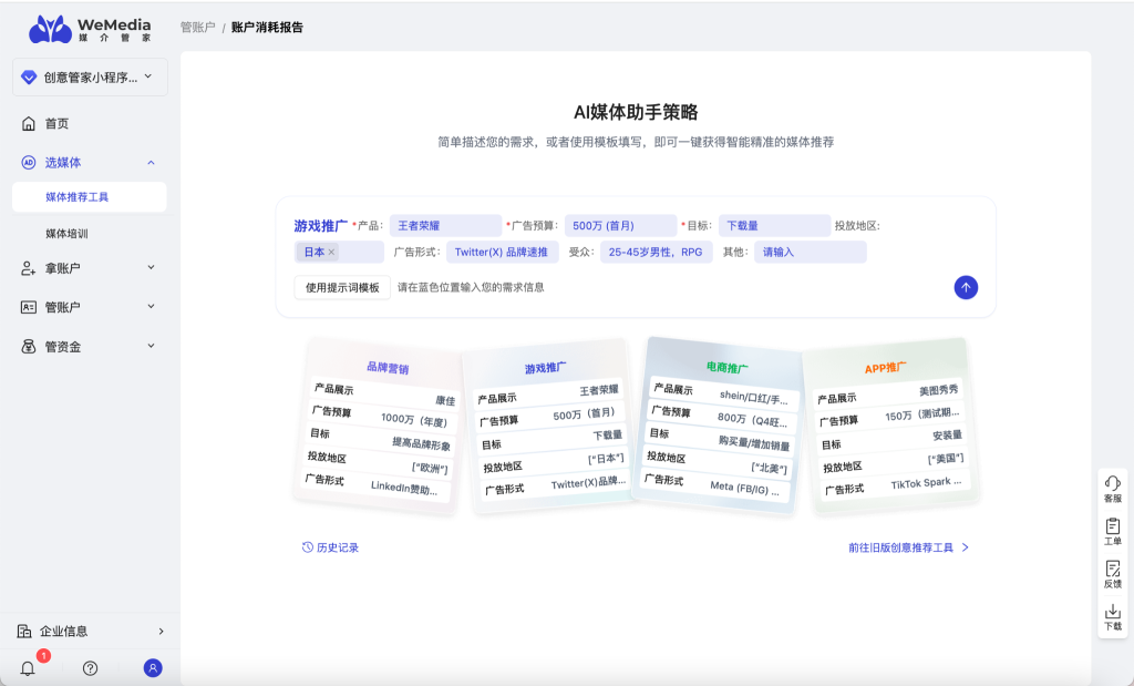不管是推手游、做电商、打品牌,只要输入需求,工具会自动匹配对应的媒体和预算组合。还搭配媒体开户入口,一键免费开户,省心省事。