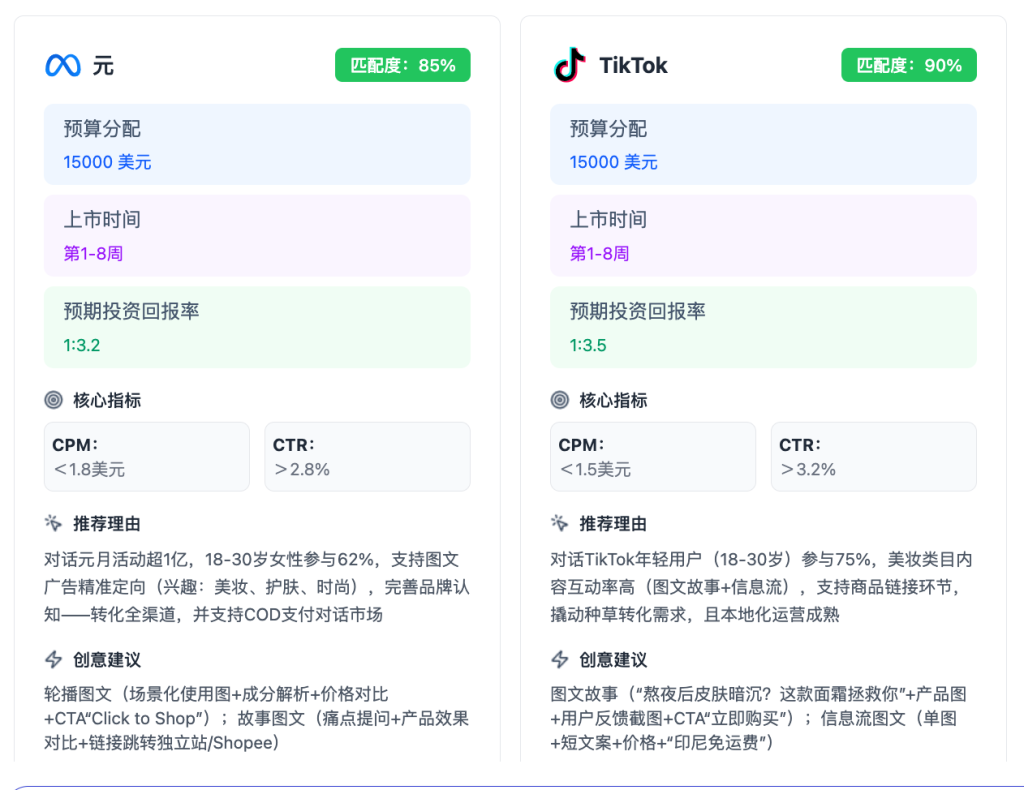 基于你的预算,工具会根据拉新+收割的逻辑,直接给出各平台的预算占比,避免把钱全砸在一个平台。