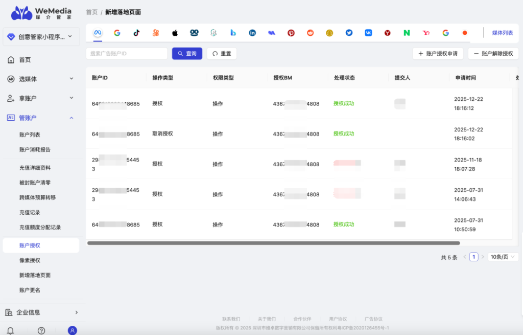 WeMedia 将 账号、BM、像素、应用、域名 等关键资产统一拉到一张视图中,便于快速核对归属与授权关系,明确管理员与关键变更点,从源头减少因资产分散、权限不清导致的受限与断投风险。