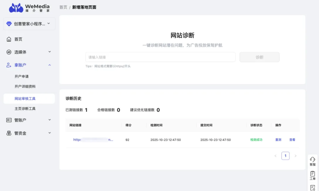 WeMedia 支持将主页(FB)与网站纳入监控列表,自动识别风险项并提示优化方向,帮助团队在放量过程中持续校验承接一致性,降低因页面问题触发误导判定而导致的停投风险。