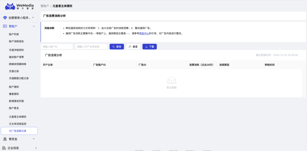 WeMedia 将账户违规与广告预警统一收拢,并按负责人推送提醒;一旦触发风控,协助整理申诉材料、跟进节点,让恢复过程可追踪、可推进,尽量缩短投放中断时间。