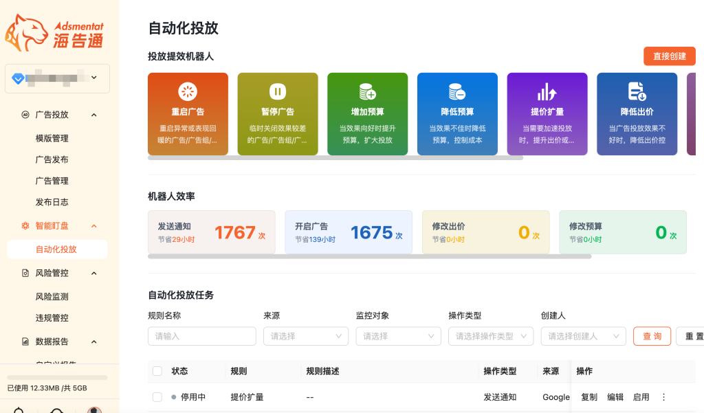 - 「智能盯盘」支持在Meta/Google不同层级按指标设定规则,触发后自动执行日常广告管理动作,还能把规则推送到邮箱提醒。