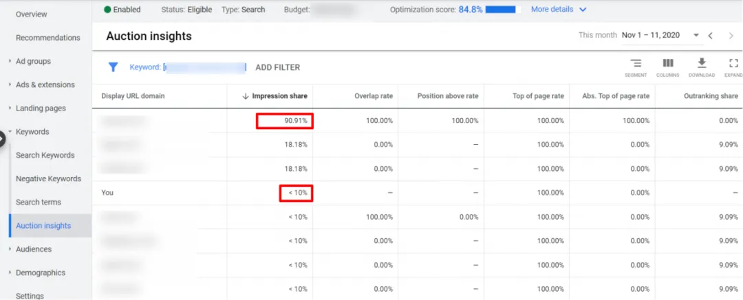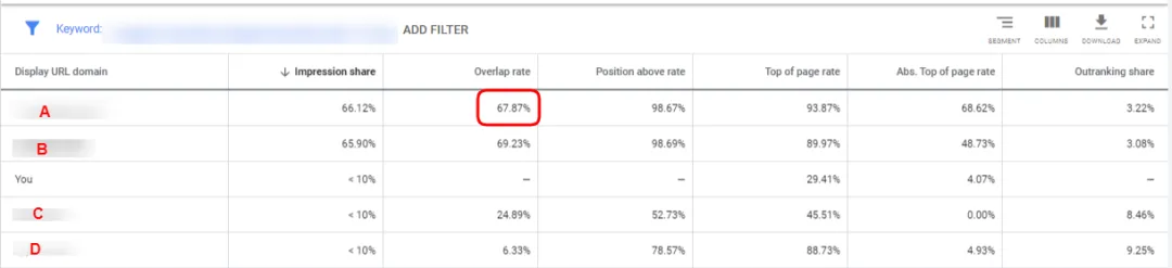 在挖掘新关键词的时候,Auction Insights是个很好的帮手。你可以通过它来查看在你计划定位的关键词中,哪些竞争对手始终占据前列。