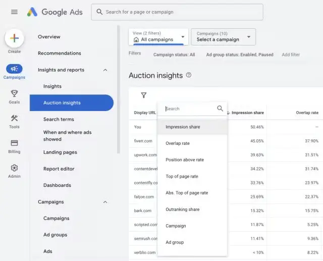 Google Ads的竞价洞察工具-Auction Insights,专为出海广告商打造,它能展示你的广告在Google搜索和广告平台上的出现频率。通常,在广告展示后的一天内,你就能通过它获得广告系列排名的最新信息,为你的广告优化策略提供参考。