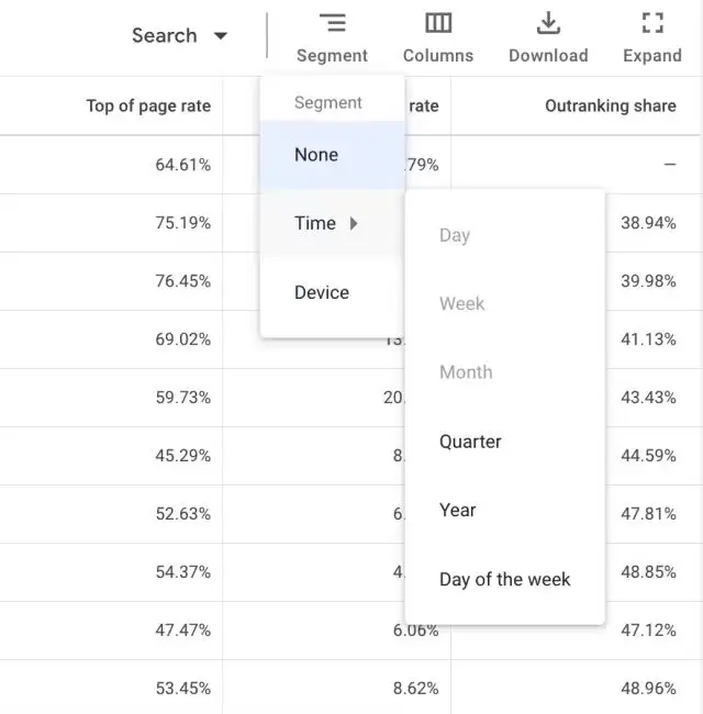 为了对Auction Insights数据进行更细致的划分,你应点击“细分”功能,并依据日期、时间或设备来决定如何拆分这些数据。
