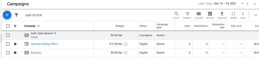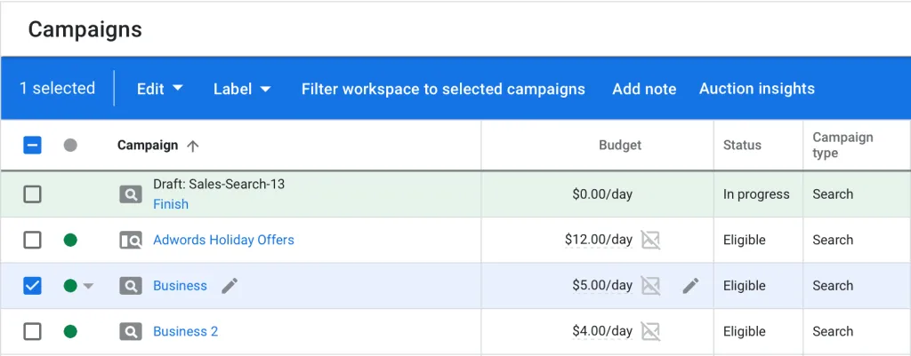 步骤3:通过勾选旁边的复选框,选择你希望分析数据的广告活动、关键词或广告组。选择完毕后,仪表板顶部会出现一条蓝色横条。