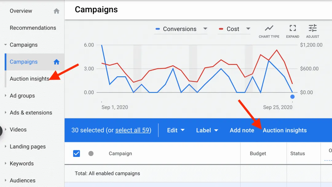 步骤4:如果你对整个账户的竞价分析报告感兴趣,也可以通过左侧导航栏找到并点击进入,它位于“Campaigns”(广告系列)下的“Auction Insights”(竞价洞察)。