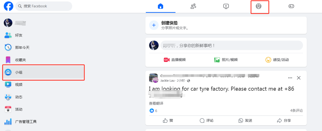 - 搜索竞争对手的专页或群组,同样地,申请添加里面的活跃用户为好友。