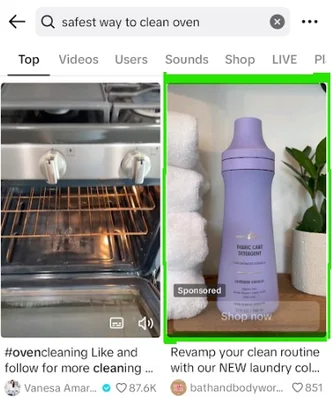 TikTok搜索广告带有“赞助”标识,它们通过TikTok的智能算法,紧密匹配用户的兴趣、搜索意图和行为。实践证明,采用这种新型广告形式的广告组,相比没有使用的广告组,有超过70%的展现了更为出色的效果。