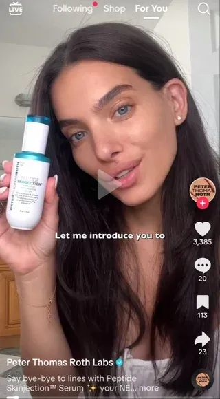 看看下面这个Peter Thomas Roth的信息流广告,你可能会觉得就像是“For You”页面上自然出现的内容一样。但要注意的是,这类广告和Spark广告有所不同,它直接源自品牌的官方账号(@handle),而非通过创作者展示。