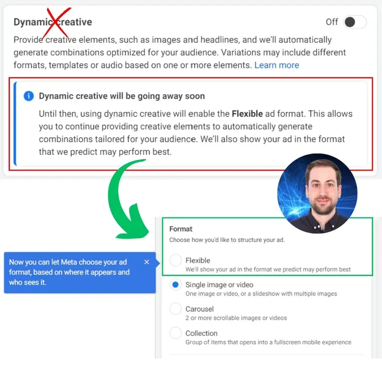 其实,从2024年6月开始,Meta就打算慢慢淘汰动态创意广告,用Flexible格式来替代它。因动态创意和Flexible格式在功能上有很多重叠,所以把它们整合起来淘汰旧的功能,统一成一个方案是很有必要的。