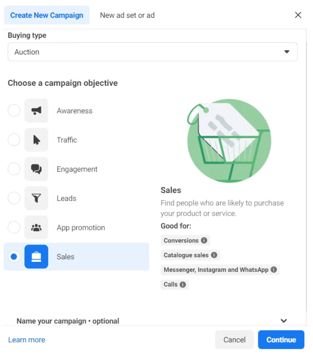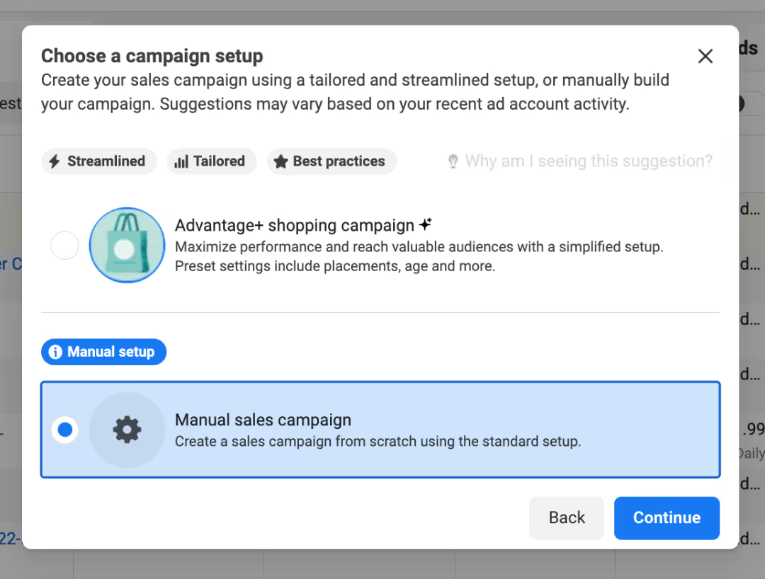 3.接下来,你可以选择Advantage+ 购物广告系列设置,或者手动构建广告系列。