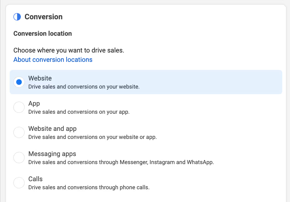 5.如果是“销售”目标,记得去转化部分设置网站或应用为转化位置。(选择“应用推广”的话,这一步同样跳过。)