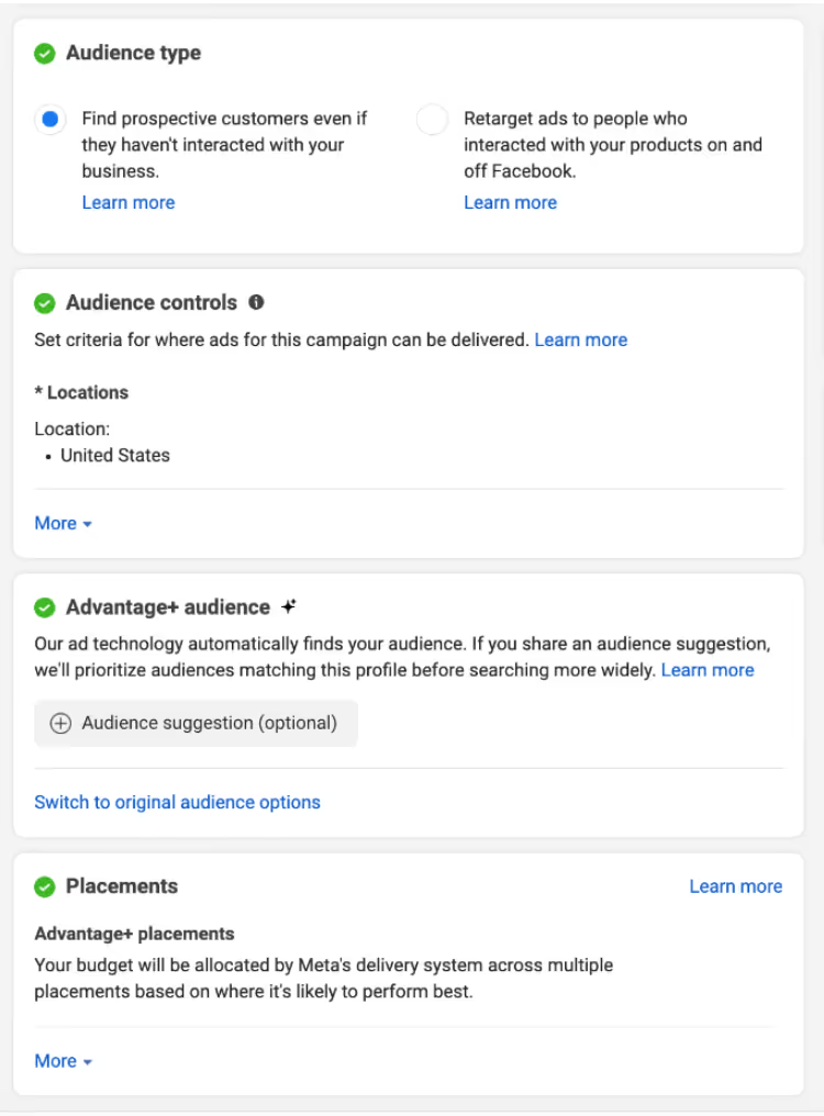 7.确保受众定位准确,你还可以选择让Meta根据你的受众建议来寻找合适的受众。搞定后,点击“下一步”。